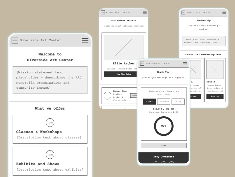 The Riverside Art Center’s website is essential for promoting fine arts and connecting with the Wapakoneta community, but its outdated design hinders navigation, accessibility, and engagement. Our redesign creates a responsive, modern platform that improves usability and better serves donors, volunteers, and the public.